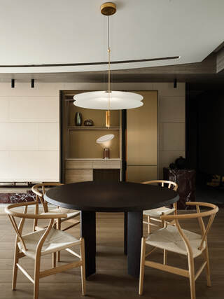 餐桌特意選用不規則造型,避免銳角干擾動線,其圓潤輪廓自然形成場域的凝聚中心;天花懸掛的吊燈不僅是照明工具,其輪廓與下方圓桌相呼應,如藝術裝置般引導空間的視覺流向。