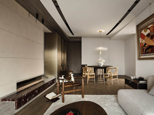 全室以大地色調為基底,搭配金屬、家具軟裝勾勒精緻細節,提升整體的視覺質感。