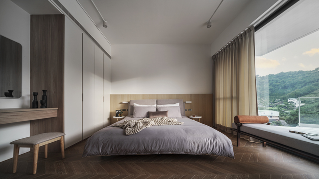 主臥落地窗邊安置長椅,為寢區的私密和戶外景色的開闊之間形塑緩衝地帶,同時提供臥室更多活動選項。