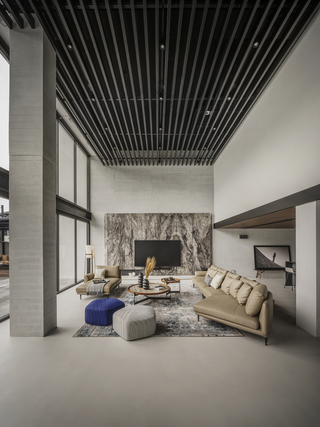 客廳結合兩層樓高,鋪排格柵式金屬天花,同時配合大理石電視牆和大幅玻璃窗,營造大器的第一印象。