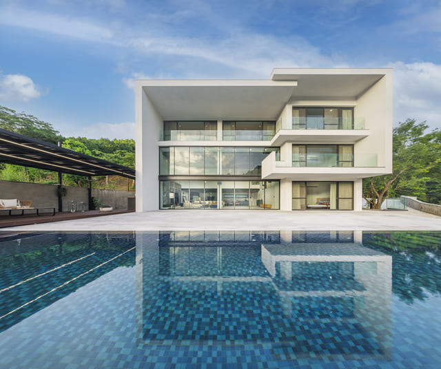 建築外觀奉行現代主義建築的精神,大面積的乳白色構成空間盒子縱橫交錯,透過俐落立面與精緻材質,鋪陳簡潔與純粹;居室體塊向內退縮,留出寬闊的屋簷和陽台,精算室內空間的分際、省卻隔牆,換來開闊的使用平面,再配合落地窗與玻璃牆的使用,降低封閉感受,提升環境與建物的親密感。