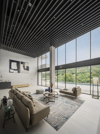 透過基礎家具定義客廳,以求最簡淨的空間畫面,建材紋理與純粹設色和窗外的大自然共構對話。