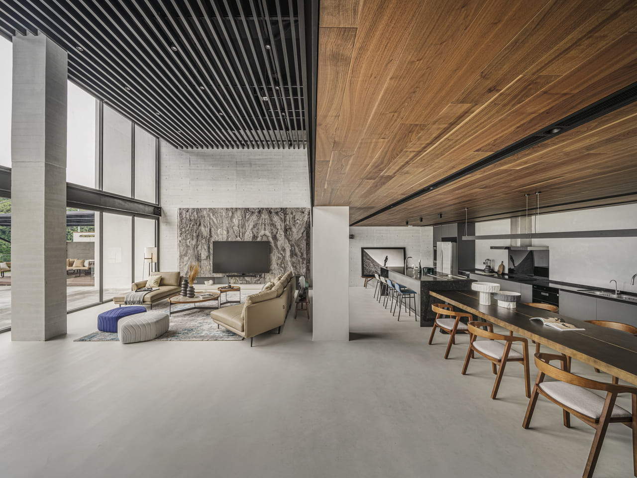 呼應空間塊體的巧妙安排,天花設計亦配合地台的高低差,在無形中構成不同場景的光影變化,自亮至暗,漸進式由外而內,引導使用者的視線步入空間深處,同時在界域標示上,採用長桌代替硬性隔牆,做出活動領域的微妙區別,令空間整體開闊卻層次分明。