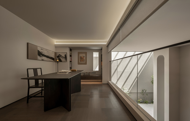 與此同時,也運用造園手法打造懸空的書房,透過玻璃結構與下方客廳形成對景,既是功能空間,同時也構成藝術裝置般的視覺語彙,讓居住者在讀書與思考之間,還能隨時欣賞室內挑空景觀。同層的茶室與禮佛室則強調儀式感,藉由適度的門檻、禪意插花與壯觀唐卡畫,營造出靜謐莊重的氛圍,令來人在踏入此地時放下日常繁瑣的思緒,尋得心靈的安定。