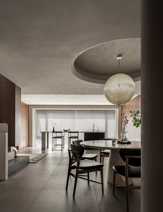 在開放的一樓空間中,吧台後側則是正式餐廳,通過內陷的天花和宛如滿月的造型吊燈,營造沉靜氛圍,與吧台區做出無形區隔。