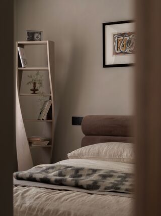 臥室床邊的置物架富有雕塑感的造型,活潑了平實穩重的設色。