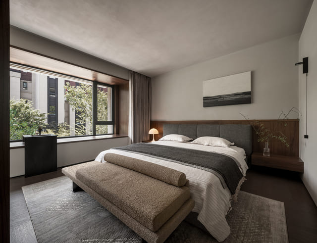 二樓的臥室設計以極簡與中古風為核心。設計師捨棄直接光源,改以隱藏式光源打亮空間,用燈帶與壁燈組合照明,創造出柔和、層次分明的光感效果。房內大面積使用木質元素,與地下層的自然主題相互呼應,同時奠定住宅溫潤親人的氣質。裝飾細節上,復古的床頭靠背、線條簡潔的植物擺設,結合掛畫與壁燈,讓臥室的視覺乾淨且突出鮮明亮點,中式結構中融入現代軟裝,營造出跨時代的美學張力,使臥室不僅是休憩之所,同時延伸設計的意趣。