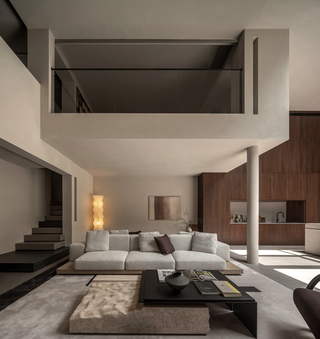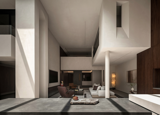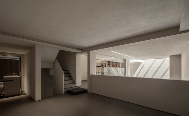 地下空間是整體設計的重點,此處用於待客和親子互動,同時肩負給予入內者的第一印象,以及業主一家豐富的精神生活。結構造型靈感源於遊戲《紀念碑谷》的場景設計,運用幾何線條規劃整體結構,精簡牆面的使用,令建築塊體與規整的方形空間宛如積木般堆疊、對話,使共享區域通透且層次豐富。當居住者穿梭其中,置身不同位置,可通過不同面向的開口彼此交流,賦予建築一種遊戲般的趣味性與層次感,讓建築不只是居所,更是充滿想像力的生活舞台。