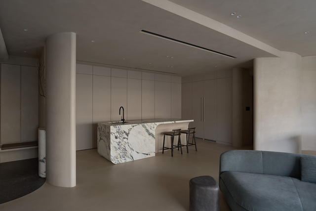 本作設計主軸奠基於「簡約純淨」的核心理念。設計師刻意選用米色調作為空間基底,形塑乾淨和諧的視覺景致。然而,簡約並非單調,設計師巧妙以大理石、天然塗料與金屬三種主要材質,在統一色階中不斷交錯、層疊與對話,譜寫出充滿細節的質感樂曲。