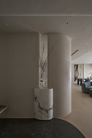 優雅弧牆劃開玄關景深,巧妙迴避直視,並引導動線蜿蜒延展,流暢銜接公領域。