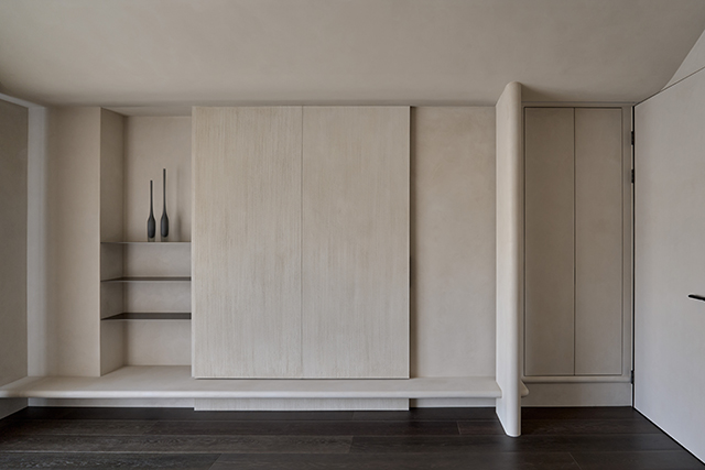 甫入玄關,一道優雅的弧形端景牆便映入眼簾,不僅作巧妙遮擋,亦引視線穿梭,向公領域流暢蔓延,布劃行雲流水般地居家動線。這面牆一分為二,中間嵌入石材平台,既可作為展示植栽的端景,亦兼具置物機能,創造若隱若現的視覺趣味。另外,玄關側牆整合龐大的隱藏收納空間,容納屋主上百雙鞋履、行李箱等雜物,滿足收納且視覺乾淨的需求。