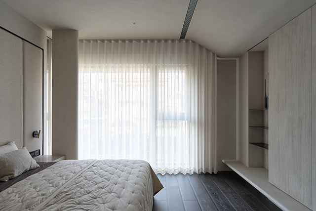 設計師利用回字型動線規劃獨立更衣室,並以帶有些許紋理的門片將電視隱藏,維持乾淨視景。天花以曲面造型包覆大樑,牆面嵌入置物層架,床側則設置地燈引導動線,處處皆是體貼生活的設計。