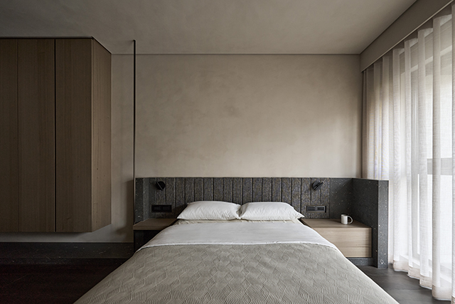 次臥床頭以繃布與石材的對話開啟序曲,將石材向外延伸至矮台,點綴鐵件與溫潤木質,交融出細膩而優雅的休憩場景。