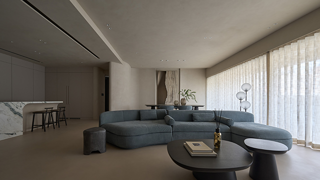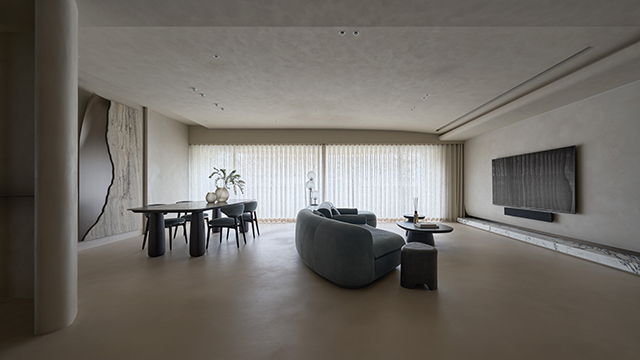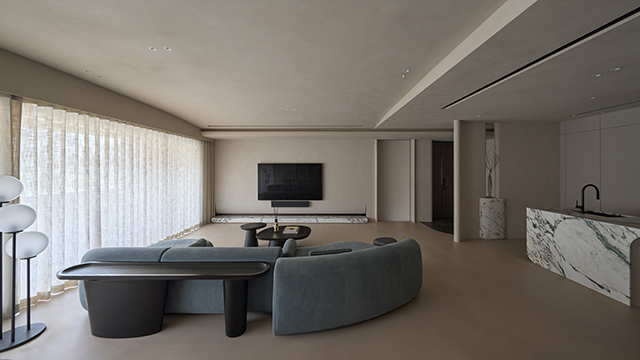 室內保留大面窗景,將公共空間規劃在採光面,並細膩引入自然光影與空間弧形語彙相搭,形塑溫潤的雅致居景。