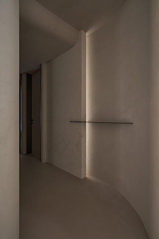 連接公、私領域的廊道,以一道曲面牆框圍,不僅避免從餐廳直視客廁的尷尬,同時塑造場景的過渡感。牆面選用帶有豐富肌理的石面,並透過脫縫設計引入柔和光帶,讓幽暗廊道轉化為充滿儀式感的轉換路徑。
