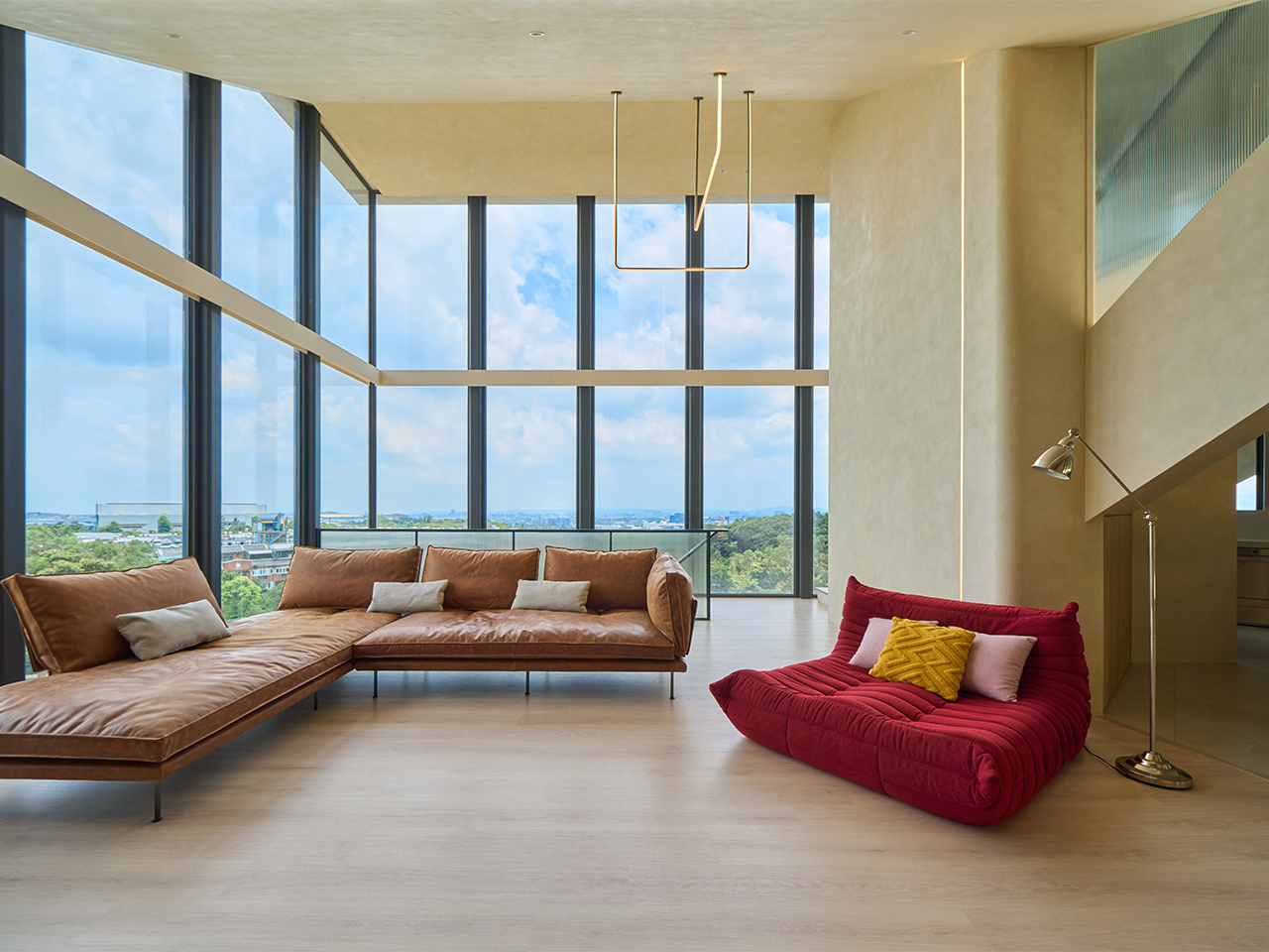 帶著煙燻感的薄櫻粉紅色構築起基底,讓空間的日夜轉換有著不同面貌。