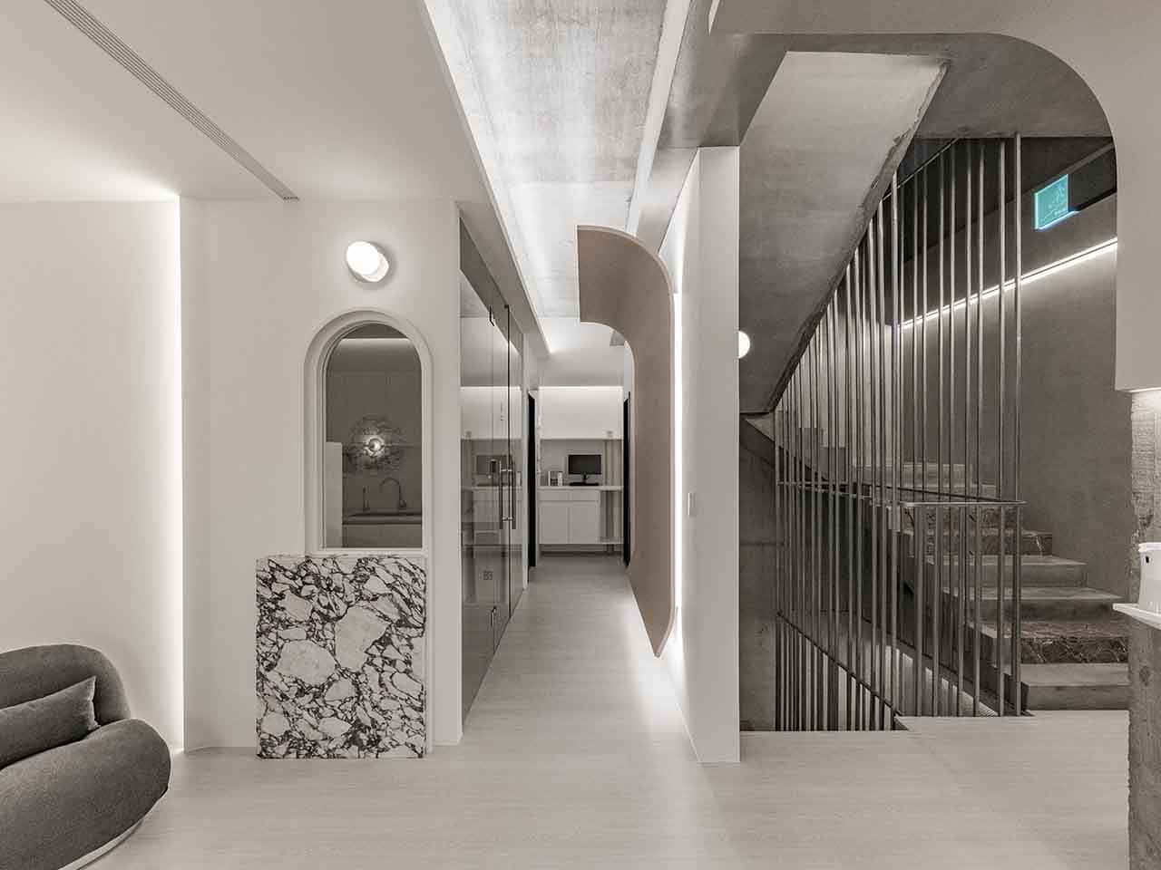這些弧形不僅作為造型手段,更是一種「視覺導引」──目光被柔軟的弧線引領,由低樑轉至高點,形成動態過渡;身處其中感受到的不是壓迫,而是一種被抬升的舒展。甚至,為保持天花板的純淨度,刻意將燈光數量降至最低,僅布局少數的嵌燈,讓圓弧語彙躍為主角。