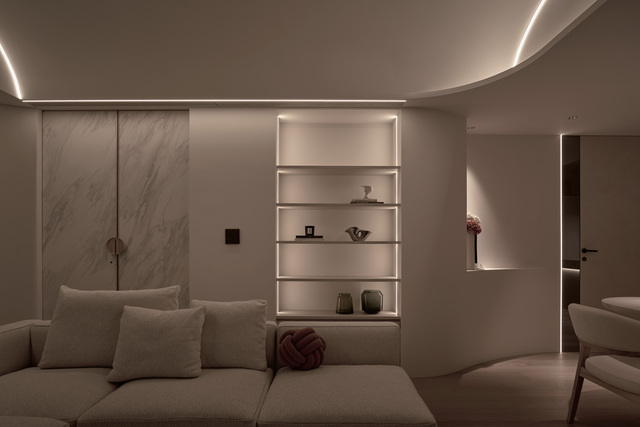 光線是另一項重要媒介。考量到外部景觀相對混雜,遂透過雙層窗簾調和,紗簾過濾視線的同時,仍保有和煦自然光,營造家宅朦朧情境;布簾則在必要時提供完整遮蔽,兼顧開放與隱私的尺度轉換。人造光源以燈條和間接照明為主要策略,讓光和結構共創空間表情,曲面在光暈映照下,彷彿摺紙邊角被微微折起,輕盈又具張力。