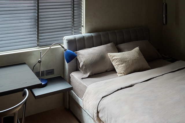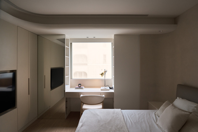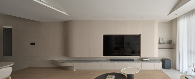 弧線元素同樣延伸至電視牆與櫃體,收整結構之餘,又確保持續流動的延展性,並將侷限轉化為具貫穿性的線條;進入主臥房時,當雙開門片全然敞開之際,與公區的造型相互呼應,使不同機能場域產生對話可能。弧形扮演著極為關鍵的語言,是空間秩序的再造者,亦鏈結起生活的律動。