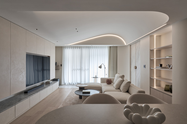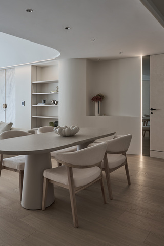 全案利用設計手法化解既有結構的限制,並將業主需求轉化為獨特的語言,弧形猶如柔軟線條,重新織起天花板及立面的脈絡,光線則作為載體,不斷捎來流轉的明暗,勾勒生活的深度與風景。
