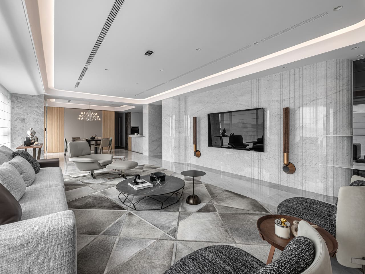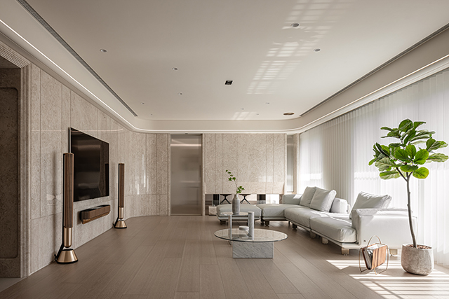 綜觀全貌,最鮮明的設計語彙來自於弧形線條的運用。利用柔和蜿蜒的弧度,巧妙地化解建築中原有樑柱的壓迫感,並在天花板、牆體與家具形體中延伸,化為貫穿全室、極具辨識度的元素。這些弧線既是結構的修飾,也是引導動線、界定場域的媒介,將客廳、餐廳與書房自然串聯,營造優雅而富生機的畫面。設計師以「光影流動、溫潤人文、材質交融」作為主軸,使室內流露出柔韌的藝術性,在弧線的環抱之中,日常起居與社交情境皆可自然而然地展開,凝聚成溫潤且具生命力的家居篇章。