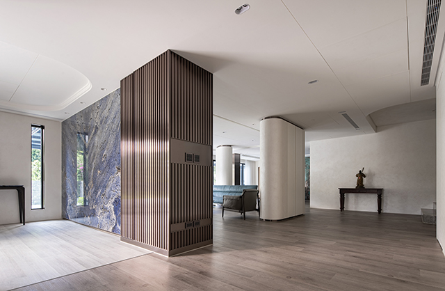 以開放式手法擘劃公領域,綠色石材烘托出如山林般靜謐的質地。