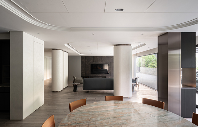 面對無法拆除的樑柱,相即團隊並未加以遮掩,而是將其轉化為空間特色──柱體藉由形變及包覆,抽象演繹溪流中的鵝卵石型態,既具收納機能,也營造獨有的韻律感,讓建築結構化作亮點。設計語彙則講求「純粹」,室內主體乾淨俐落,色彩主要來自兩個面向:其一是窗外綠意的延伸,其二是溪石意象的轉譯。業主期許將石材的時光積累以及粗獷細膩並存的質感帶入家中,因此,玄關牆面、餐廳牆面及餐桌桌面皆採大理石,為住家注入有機的肌理層次。