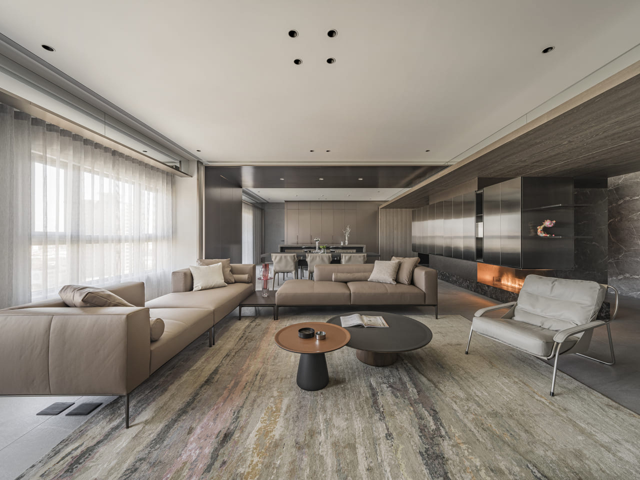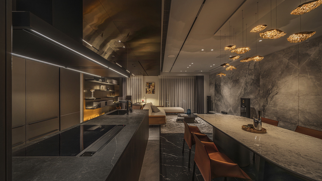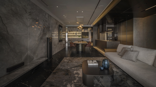 大面積的連續面則透過進退面或燈帶處理化解厚重,同時運用懸浮結構輕盈視感,當光線掠過石材或特殊漆表層,反射的明暗層次化為匠心獨具的表情,讓視覺在移動中擁有豐富變化;對細節的重視則從鐵件收邊以及如雕塑般的量體切角中可見一斑,處處皆可見工藝介入的痕跡。