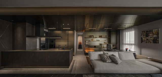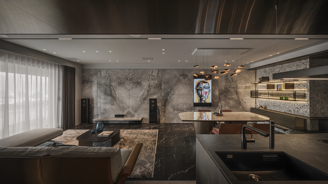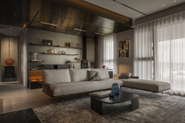 《藝境奢居》為臨河住宅,可俯瞰基隆河景致,一對熱愛城市氛圍的屋主選擇於此開展新篇章,沈志忠以量體分割與比例調度為主軸,再融入工藝與美學的思考,將理性結構與感性層次帶進日常,藉此回應業主對於「精緻而華麗」的追尋,並鋪陳開闊而流動的韻律。
