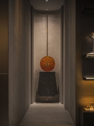 業主有風水上的考量,因此走道的開口被刻意放大,提升氣場的流動,不過,柱體的存在則成為需要克服的問題,設計師利用框架結構重新描繪過道樣態,形成「一進、二進」的節奏,移步換景間彷彿穿越畫框,空間脈絡因此變得更清晰,景深也更為鮮明。端點以弧形端景收束,帶出被包覆的穩定氣息,展示檯面則以懸浮手法搭配垂直光源成為焦點,不僅讓視線更具象,並產生若隱若現的層次。