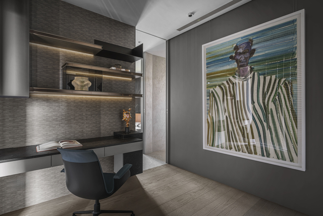 兼具次臥功能的書房。書桌形體好似一座俐落雕塑。
