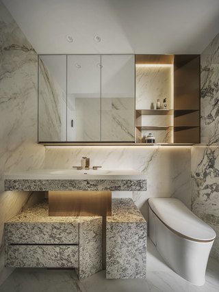 主臥衛浴洗手檯的切角令衛浴空間的設計力道更為突出。