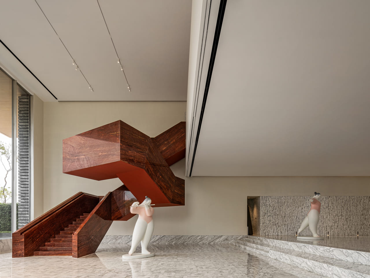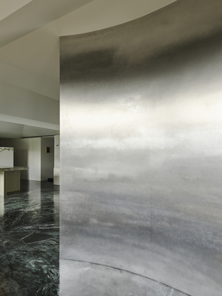 金屬光影與深色石材交織,讓場域在轉折處展現材料最純粹的語言。
