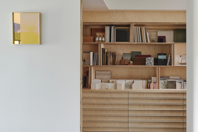 為了預留可能性,水相設計同時也希望將過去的經驗重新整合進新辦公室,入口的配電盤門片取自舊案場剩餘的老木料,經切割和染色後化為藝術品;牆面看似柔和的水泥裝置也源自過往商業空間的打樣,經結構重塑後成為新創作,這些物件不僅將團隊的過往點滴具象化,也延續了記憶的價值。