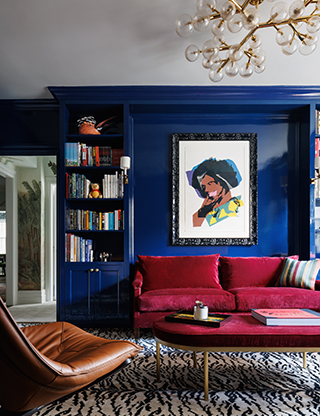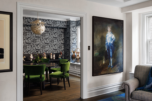 客廳裝飾藝術家Jake Wood-Evans的兩幅畫作,以其層疊的藍綠色調為全室奠定色彩基調,營塑深邃的藝術氣質。