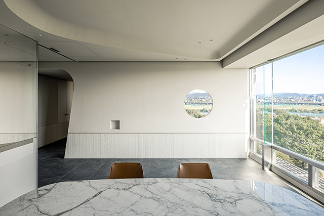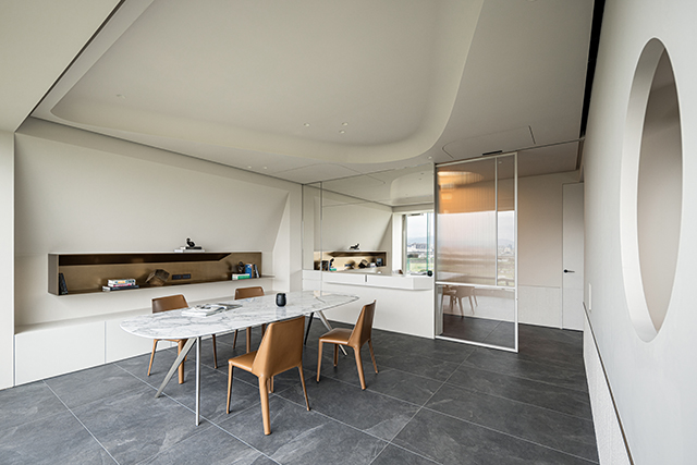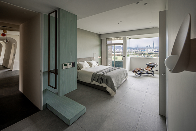 連接公私領域的廊道,原是結構上的難題,卻在設計師手中蛻變為空間亮點。斜牆設計向上浮起,弧形輪廓勾勒如同綠意石洞般的沉浸體驗,行走其間彷彿置身天然洞穴,心境隨之沉澱。天花板的弧線造型讓光線自然停留,形成隱約流動的光影。這條「河流廊道」不僅是動線連接,更是一段心靈過渡,在場景轉換的過程中,令人逐步卸下外在紛擾。