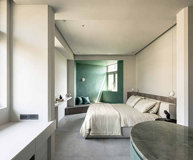 妹妹房巧妙利用畸零空間,布置綠色立面的臥榻區,結合戶外光影,構築令人流連的休憩角落。