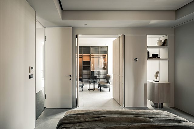 兒子房更衣室採用雙開門,開合間光線流轉,儀式感十足;木質基調內斂沉穩,而起居與就寢區的正對關係,則彰顯秩序美感。