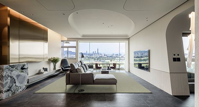 客廳作為場域核心,以整面落地玻璃迎接絕佳視野,少了女兒牆的遮擋,讓綠地景致一覽無遺,遠方101大樓彷彿成為牆上的動態畫作;窗邊特別設置兩張可360度旋轉的單椅,讓屋主能隨心選擇面向景觀或室內,強化人與環境的對話。弧形天花不僅修飾結構樑柱,更讓映於其上的光線自然流動,創造隨時間變化的光影戲碼。沙發後方金屬櫃以精緻細節作點綴,滿足屋主對奢華感的期待,與之對應的電視則巧妙延伸空間景深。