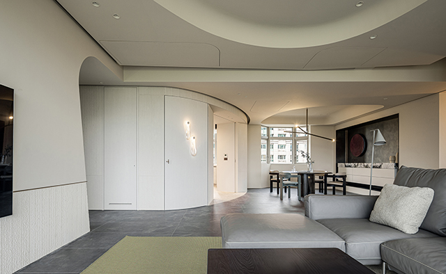 客廳以弧形天花修飾結構,光線輕映其上流轉,刻劃隨時間變幻的光影戲碼。