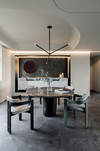 餐廳與廚房以開放式布局與客廳相連,廚房中島弧形輪廓如同河流的自然彎道,與廊道的流動語彙呼應,側邊內凹設計則符合人體工學,延續流域概念。特別的是,設計師選用帶有水流紋理的天然石材檯面,與深色地坪形成深淺對比,彷彿河水與岸邊的對話。另外,廚房門片隱藏式把手的細節處理,展現對機能與美學的同等重視,為日常增添驚喜感。