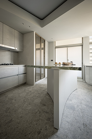 廊道弧牆向廚房延伸,如河道般細膩流淌,將餐廚區與客廳串聯一體,搭配廚房石材外牆,藉其細膩紋理點綴精緻。