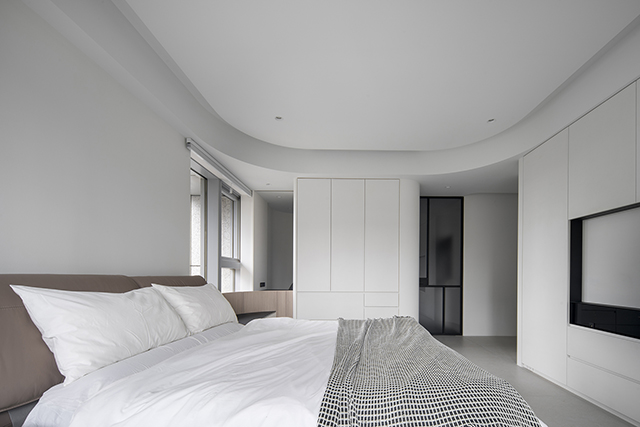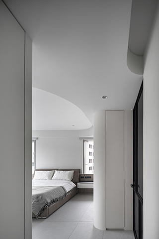 主臥延續整體風格,以弧形修飾天花弱化沉重樑柱,同時在牆體與櫃體之間柔和轉折、溫潤視感,悄然軟化生活稜角。