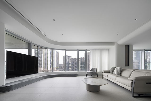 設計呼應建案特色,將建築弧線延伸入室,同時不以傳統電視牆為主,改以石材底座結合懸空電視,與窗景融為一體,將極簡風格推向極致。