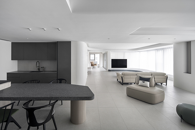 以「一筆弧線」為主要手法,利用弧形語彙修飾生硬轉角,自然描繪牆體與櫃體輪廓,引光影躍然於上,倒映出豐富律動。