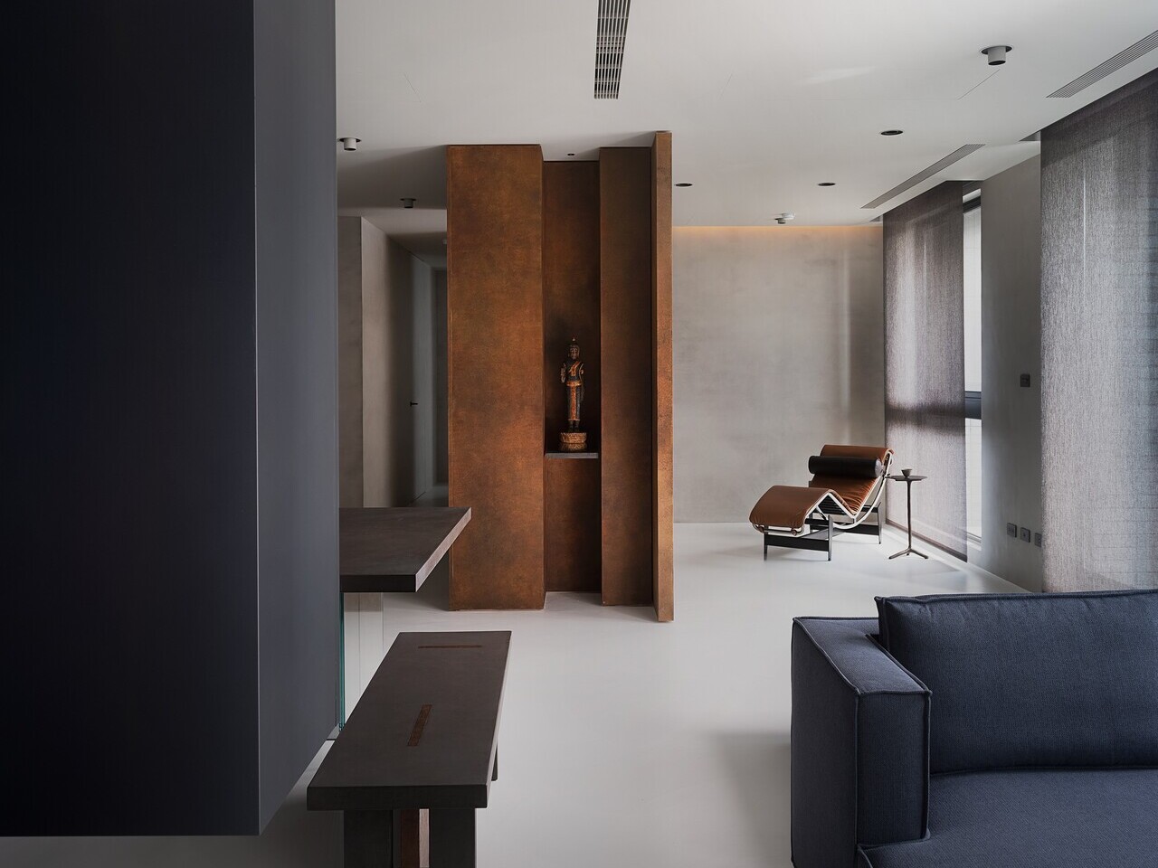 方信原進一步分享,整體色彩和材質延續灰白語彙,讓多年累積的軌跡溫和地過渡至新的家庭階段。另一方面,由於業主對結構的秩序感有其堅持,不喜歡過多起伏造型,建物既存的圓柱兩側再次以頂天立地的書櫃圍塑,加強書籍的收納量,並以鏽鐵塗料呈現質感,回應業主偏愛帶時間感的物件;光線依舊能穿梭於通透的結構框架,讓新介入的量體仍能協調融入舊空間的脈絡中。