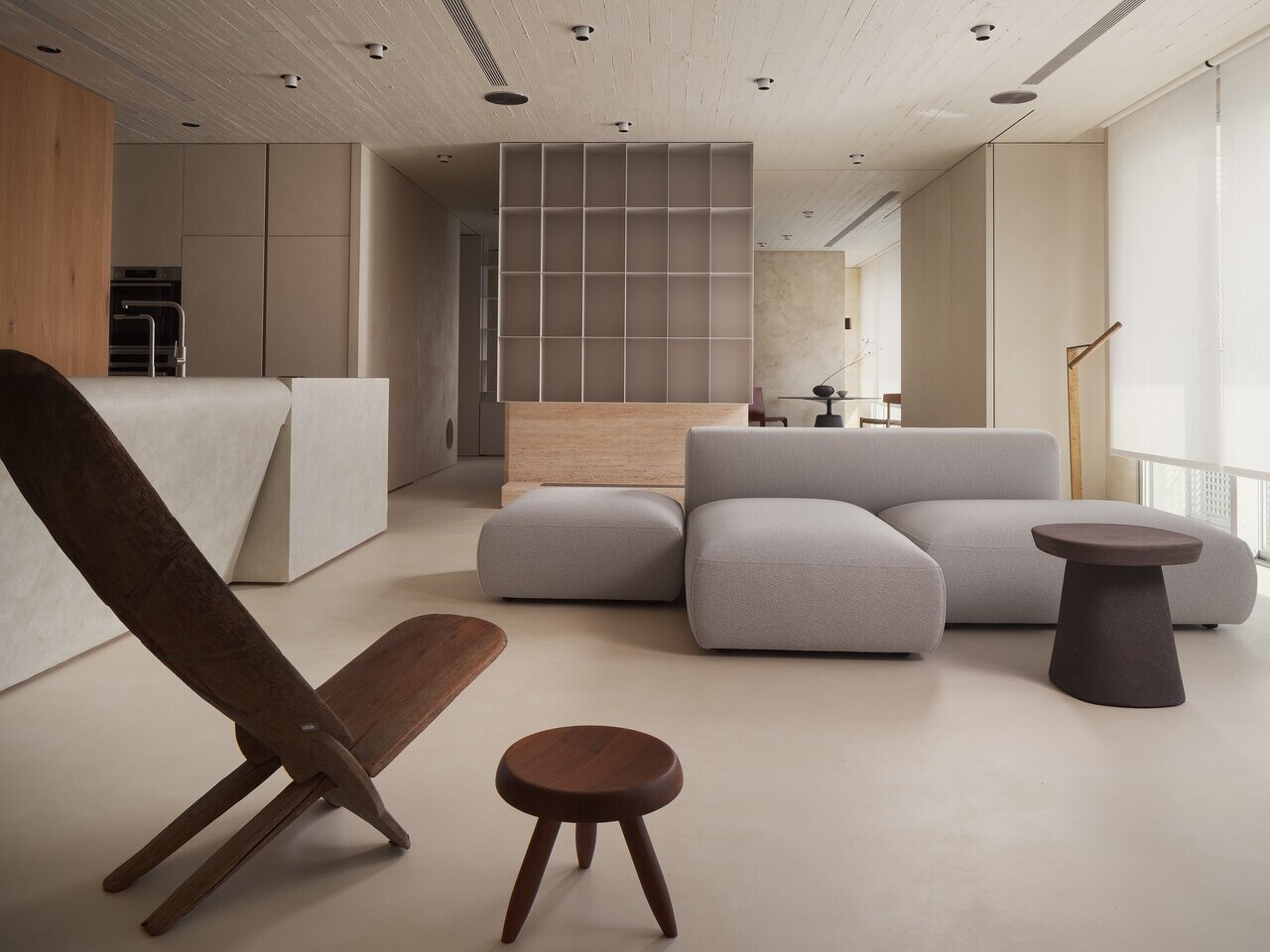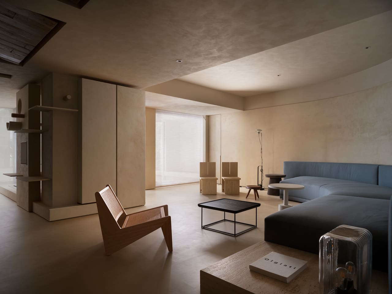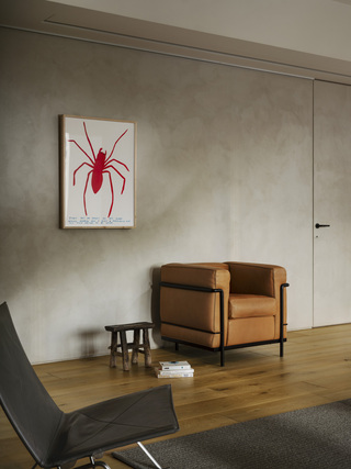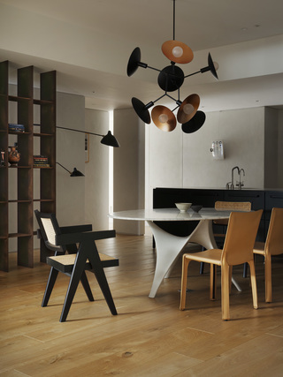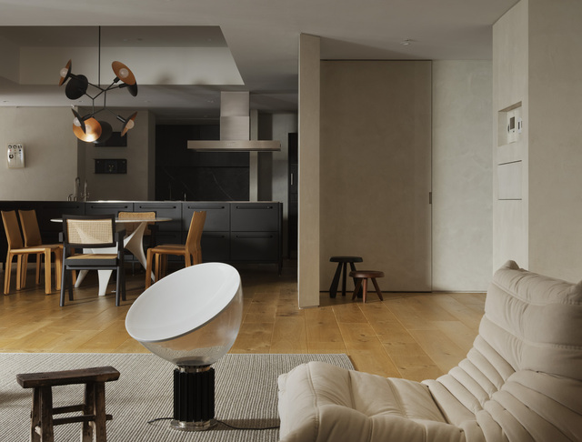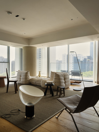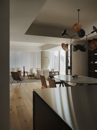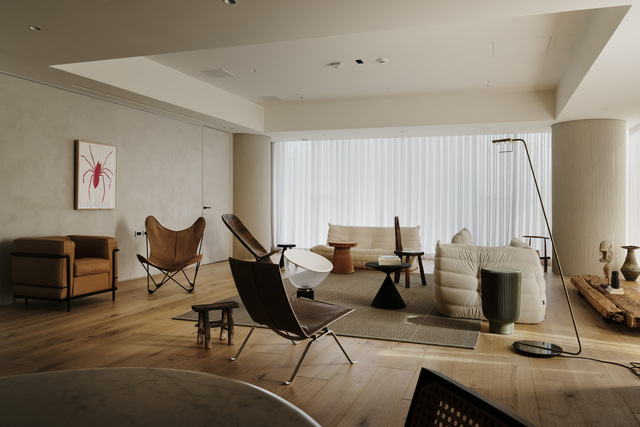 而業主收藏的多張經典座椅則順勢自然散落於空間中,既符合居住者隨興、不拘束的個性,也避免了單一定向的家具配置侷限場域的可變性,維繫畫面的自由。訂製的舊木大茶几則轉為連接窗景的緩衝節點,坐臥之間的視線得以向外延伸,讓生活重心更貼近採光與景致。