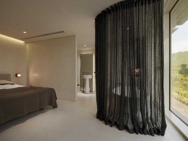 浴缸區以紗簾做遮擋,隱約間保有私密性,帶來悠然且流動的律動感。