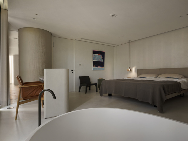 主臥室則因女主人偏好隱私,將睡寢與衛浴之間的半穿透設計轉為更實質的界定,但仍不設門片,再加上地坪的無縫接軌,強化了內部流動、安靜且不做作的氛圍。房內增設的書桌成為業主靜心工作、閱讀的角落,尺度收斂而不封閉,形塑出低調卻富層次的日常場景,保留一處安然沉澱的緩衝區域。