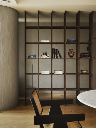 兩座頂天立地的書櫃圍繞著圓柱結構,嚴謹的序列意喻著業主對於秩序感的追尋。